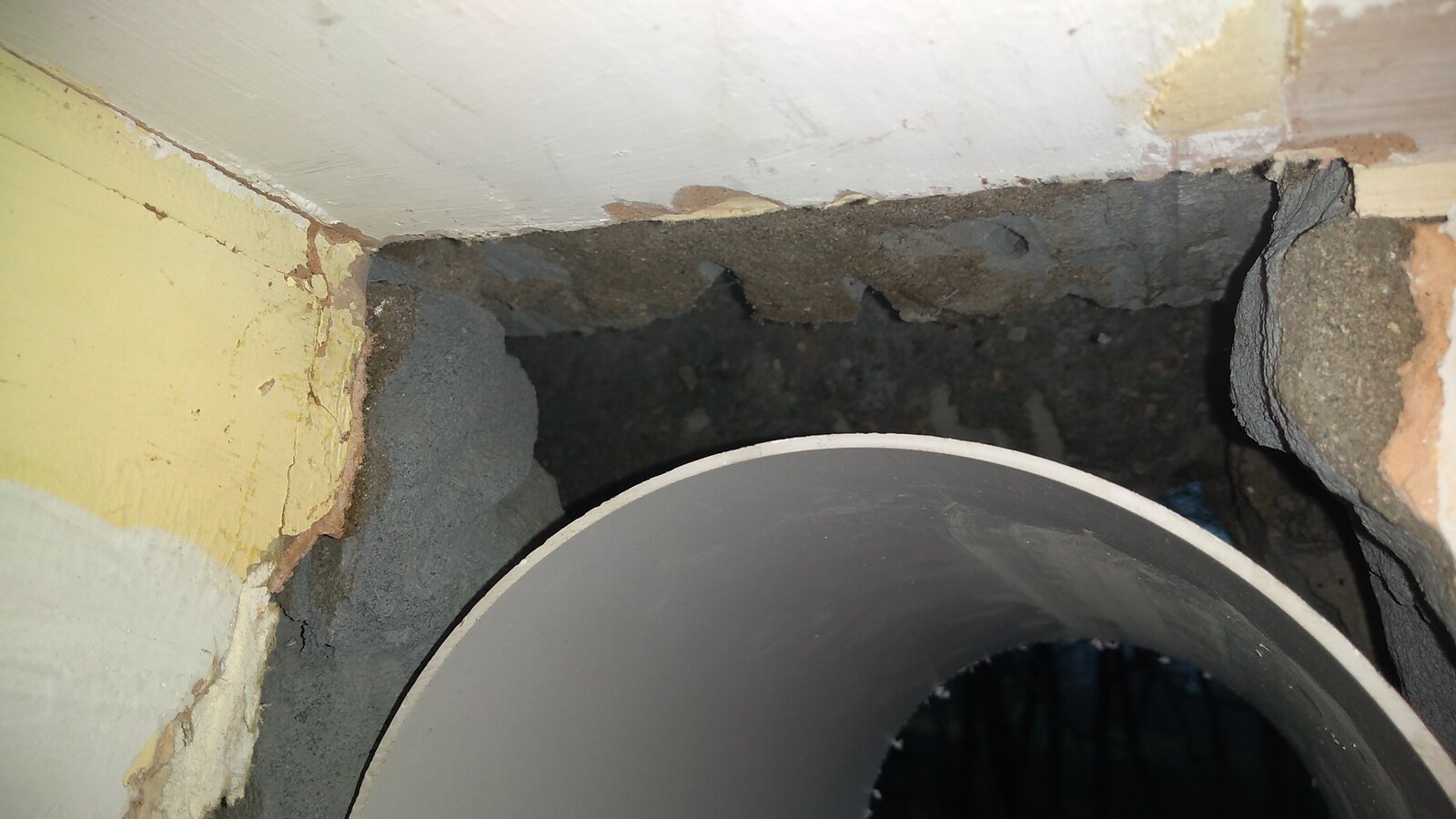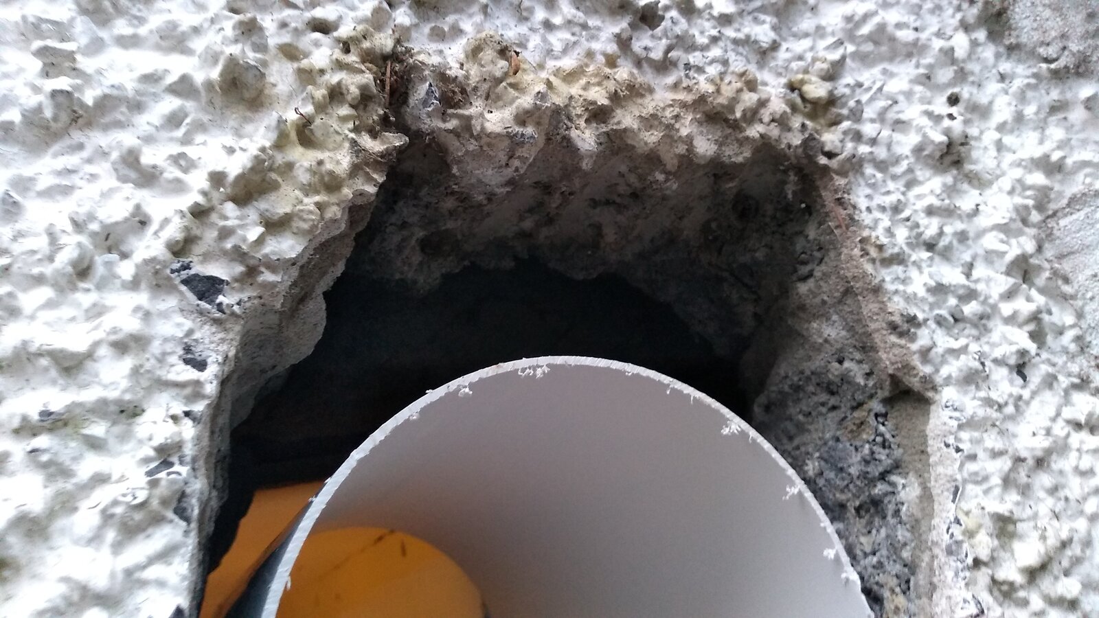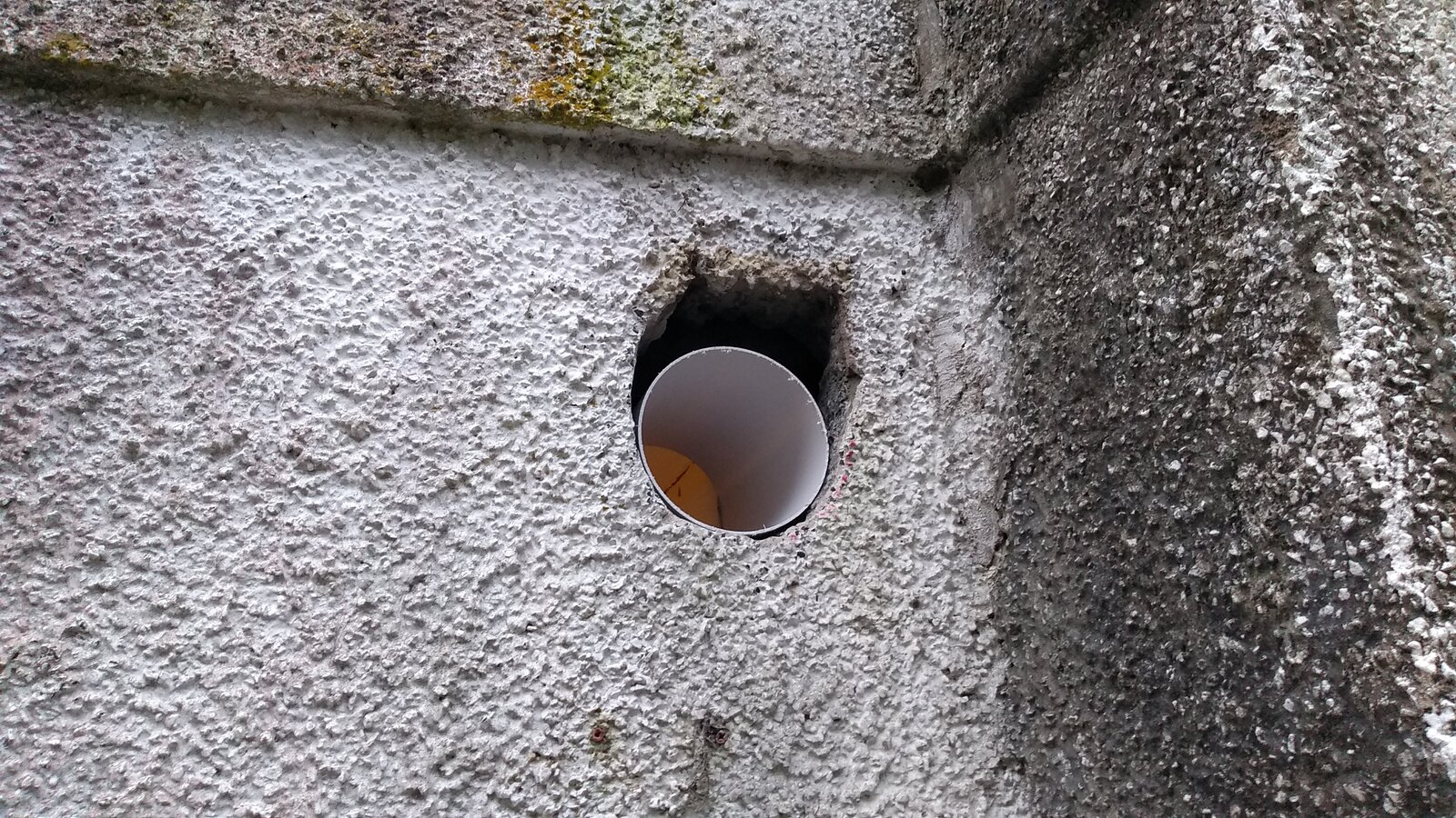I've made the hole in the wall, but because of the previous rectangular hole I'm now left with three quarters of a nice round hole, and a quarter of a large gap where the previous hole was. I feel reasonably sure none of that make much sense, so there's plenty of pics below from inside and out. As you'll see, it's a cavity wall.