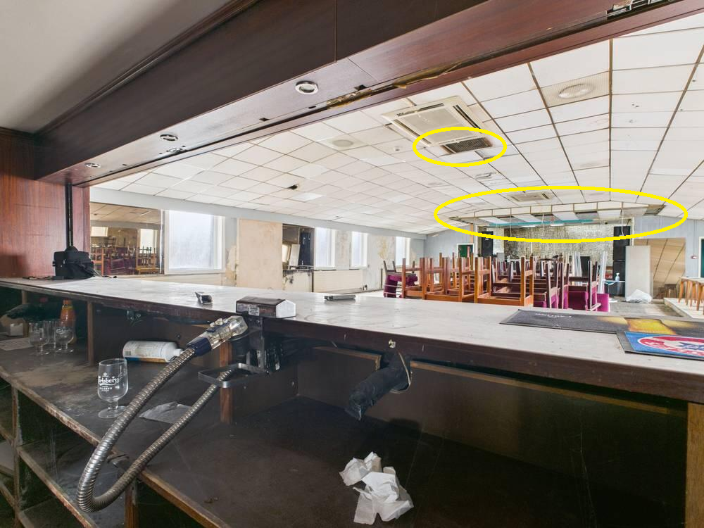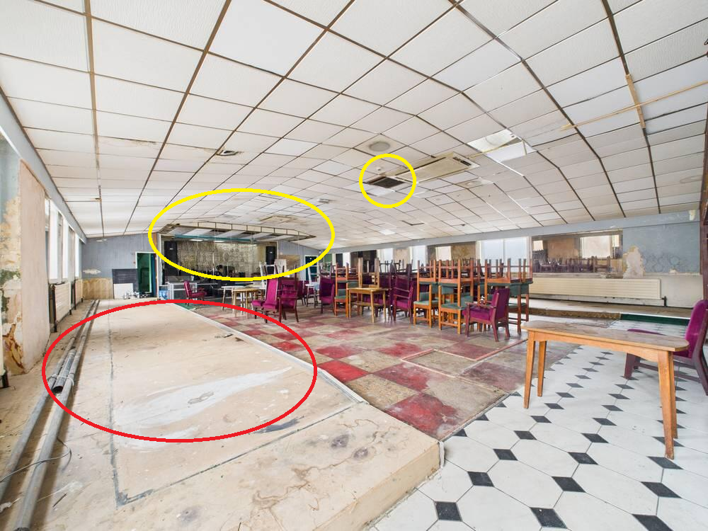 From the photos there is the upstairs with tiles missing from the celling and with the benching ripped out, which will need a new bench and upholstery covers and carpet for seating