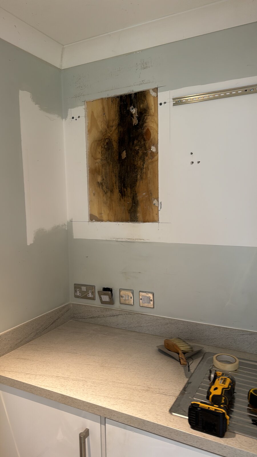 So, removed some wall cupboards a few months ago found a black mouldy area in the plasterboard behind. Realised that the silicone around the base of the shower above needed replacing as water was leaking through and causing this.