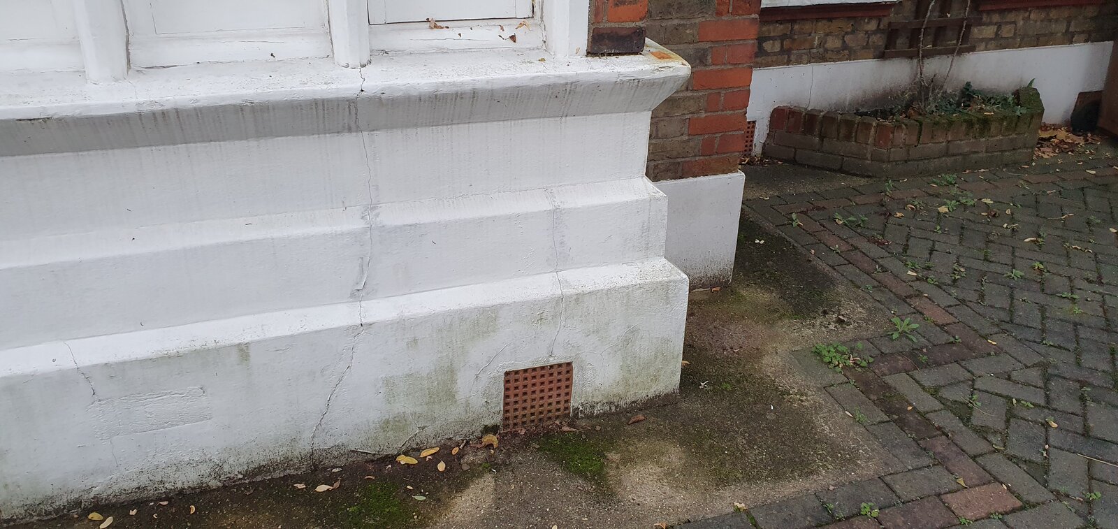 tel765 - The planter is already on the list to go before winter... the previous owner had a lot of strange ideas. The ground level has probably come up to match the height of the newish paving stones, so maybe 50mm or so but I don't think much more than that. There are 8 houses on the street and all have the same render and similar ground levels. There's no obvious signs of damp on the internal walls and no cracking. I'll take a look at polyurethane fillers.