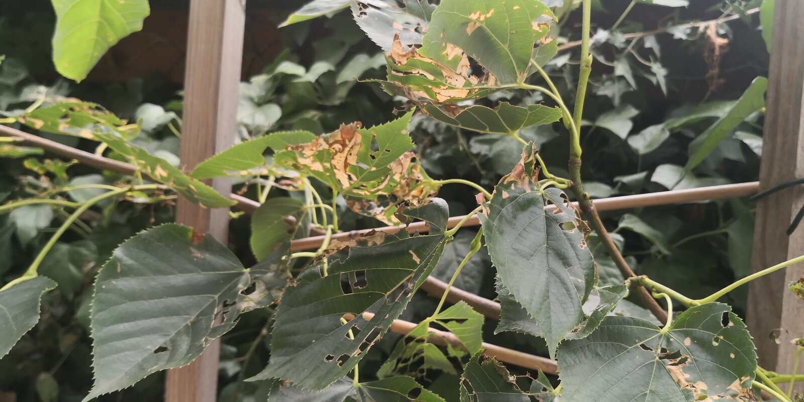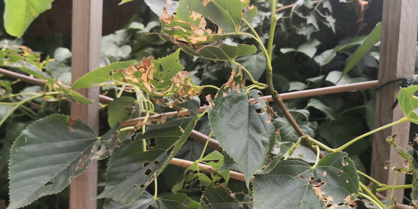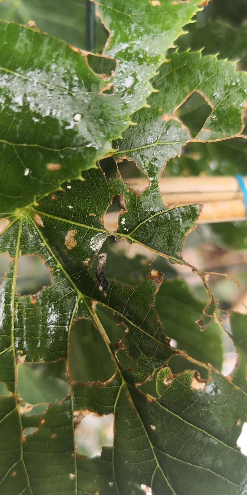 well it appears to be an insect rather than a slug. Slugs can strip tender young leaves completely, near the ground, and you will see the shiny trails of dried slime.