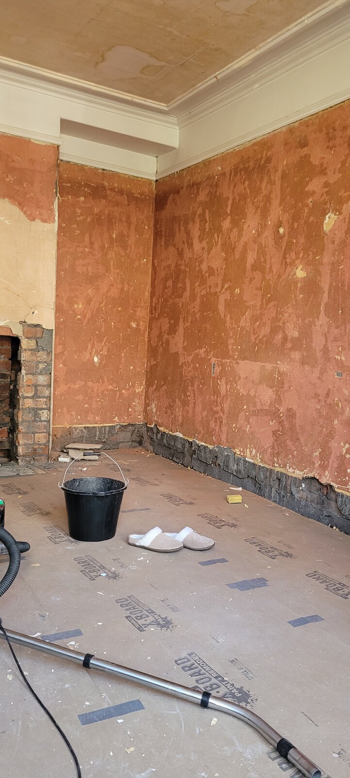 I've spent a whole week removing many years of wall paper...in a victorian house. You can see the wall prior to plastering and the plaster once dry....its obvious looking that there seems to be a reaction with the original wall covering. The plaster where it is light is powdery and you get residue on your hand if you rub the wall, the darker areas are sound. My question relates to how best to manage this? Does it need covering with something to stabilise it and re-skimming or what would you suggest, special paint? Lining paper? Any advice greatly accepted.