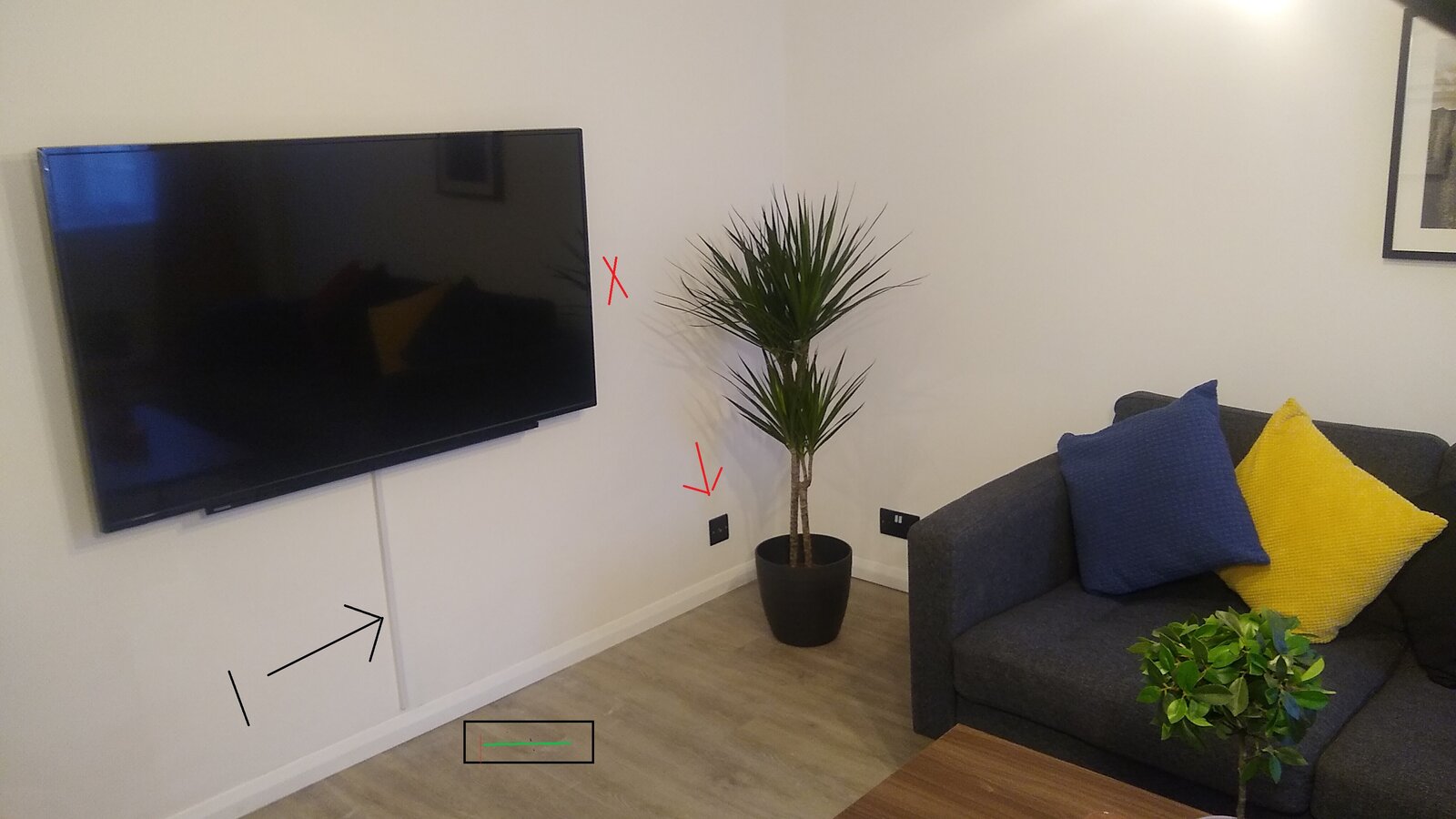 I need to get a aerial wire from the TV (right hand side - denoted by red X) to the ariel point (red arrow)