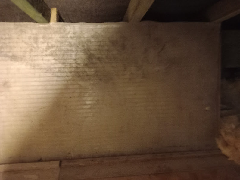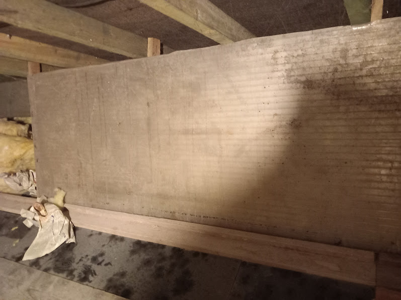 I agree with DAZB; first impressions are it seems to be a spare bit of poly carb roof sheet. Can't see any fixings, did a previous owner dump it there to stop stored items migrating into the depths of the eaves, thus becoming hard to retrieve?