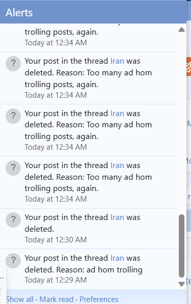 And I've been excluded from threads where no posts were deleted. That isn't equitable, nor sensible. It's pure vengeance, retaliation and a prevention of genuine opinion because it doesn't fit here, and some are incapable of disputing my comments. So I'm silenced.