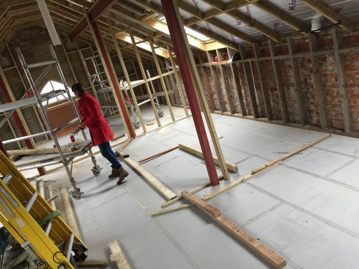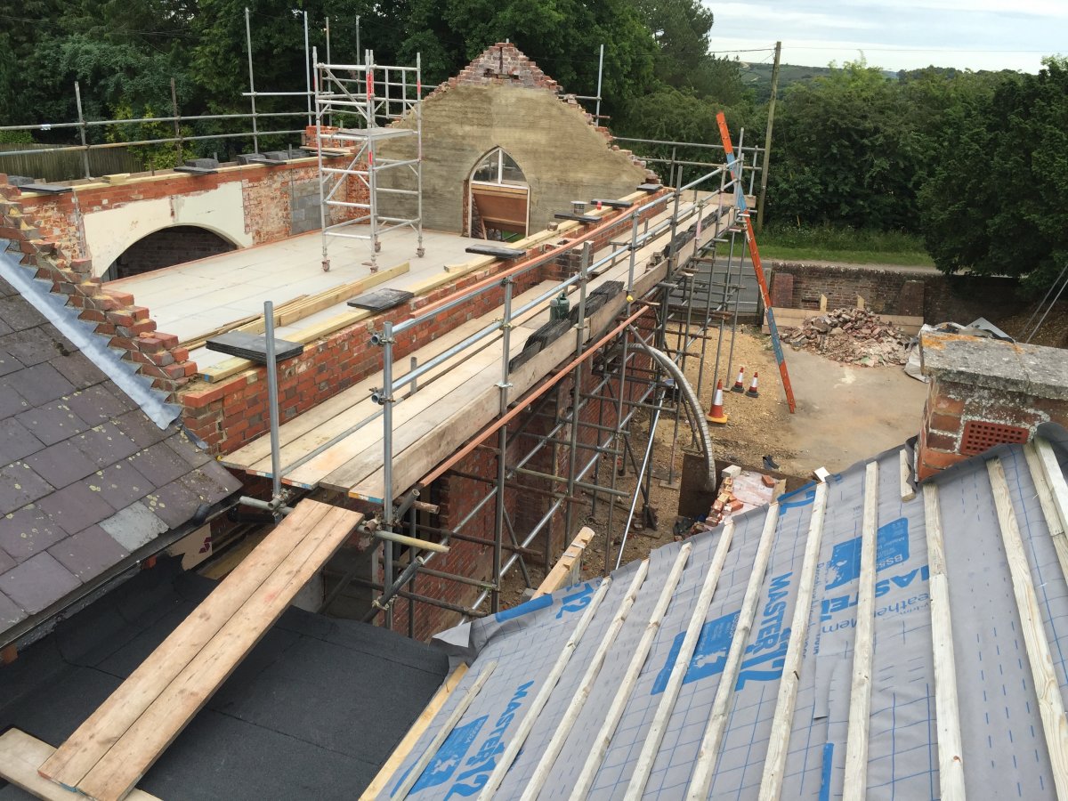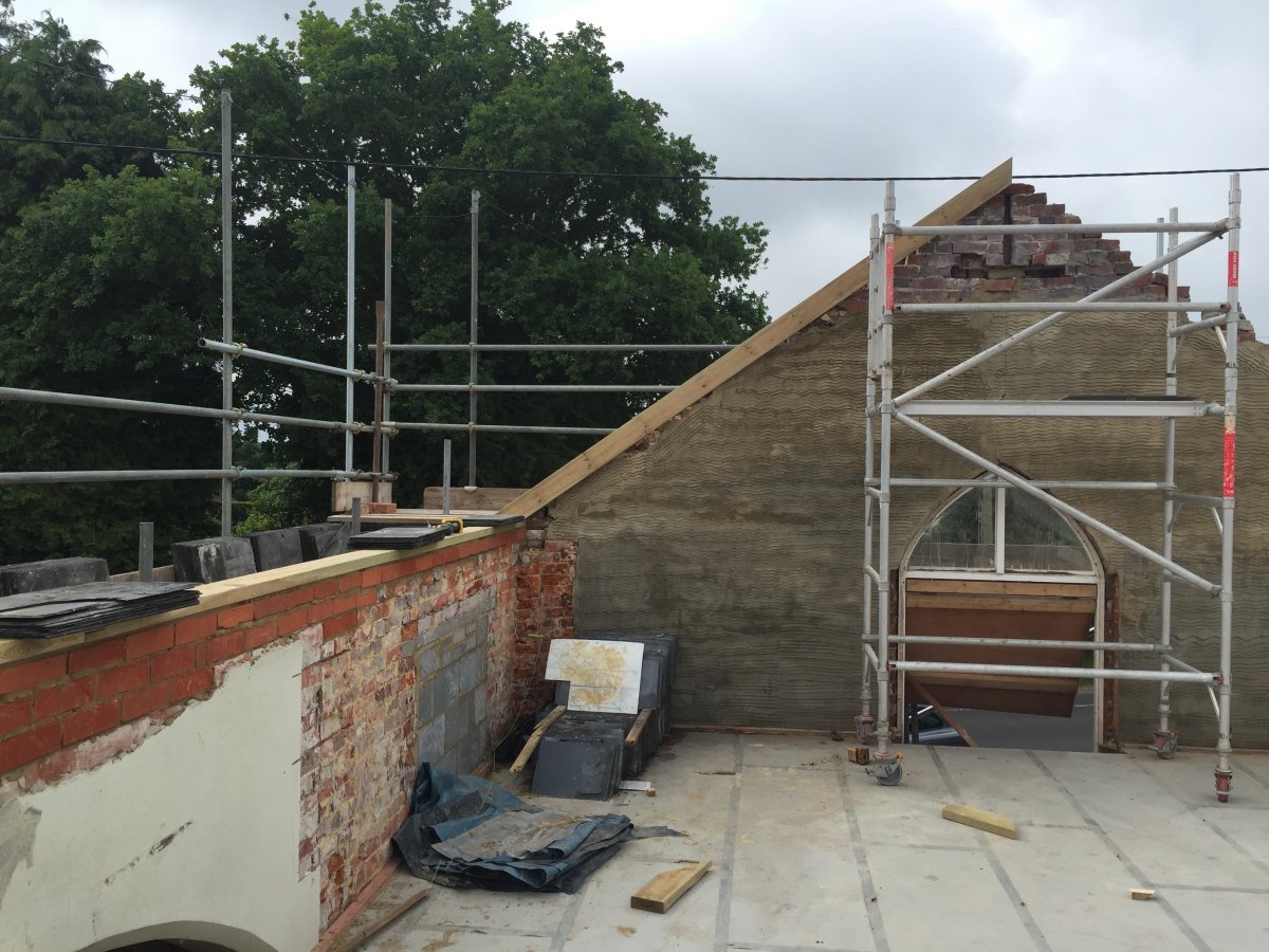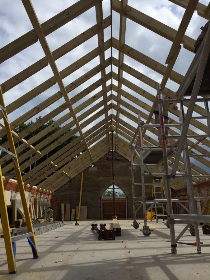 At the two gable ends we have already placed the padstones (a little lower than we think we need) and have cut our template rafters.