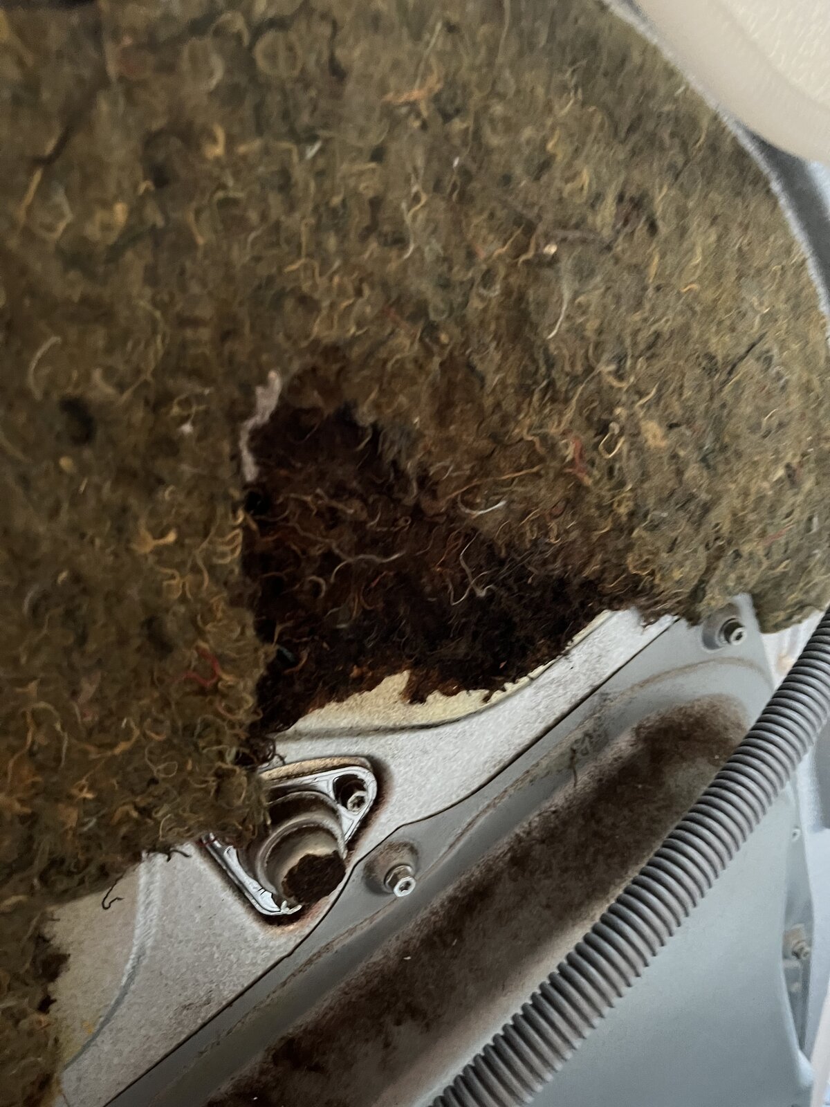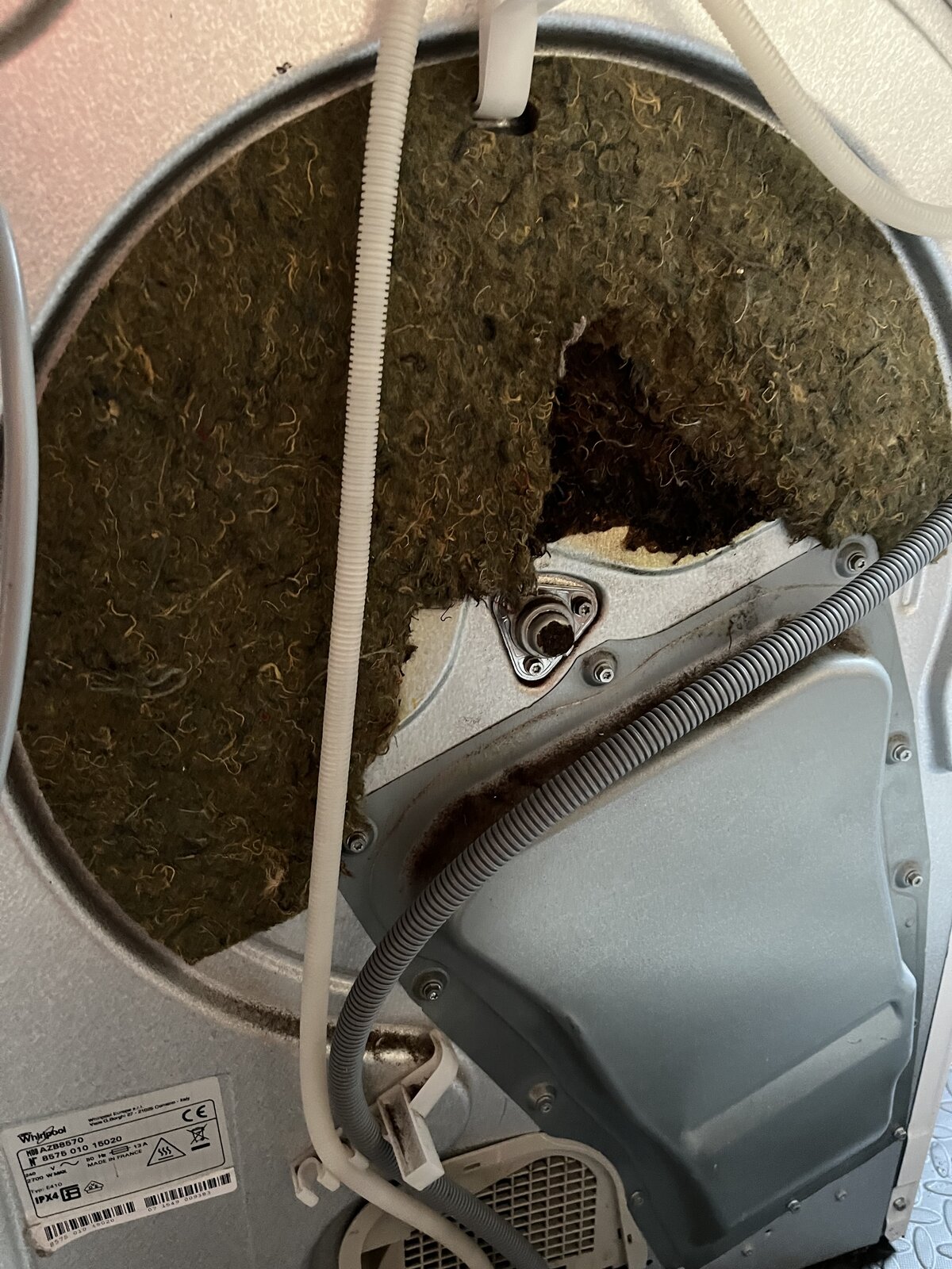 I’m looking for advice and guidance please on my Whirlpool condensing tumble dryer. I’ve pulled it out today as it’s been moved in my garage and found that the felt on the back has came apart?
