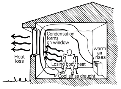 So we put a sensor (thermostat) somewhere in the house to tell the heating to come on. For the moment forget which room, just consider where in the room. So the book says on the wall opposite to the radiator, and I can confirm 90º to radiator does not work, it needs to be in the air flow. So picture number 2 shows the problem, sticking a thermostat on the window will not work. So we look at picture number 1, at the radiator seems A1, it may need setting low, as the return air has already cooled, but that is only once the heating is running.