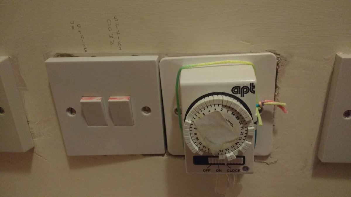 The timer turns the boiler on or off which heats water in a cylinder. If heating is required in either upstairs or downstairs the manual switches can open valves to allow hot water to flow.