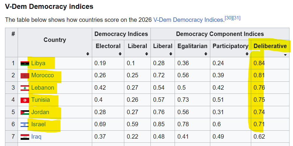 Iran is a authoritarian theocracy actually. Libya is not a functioning democracy which is top of your list !!!!By one measure several Middle East countries have a higher rating than Israel: