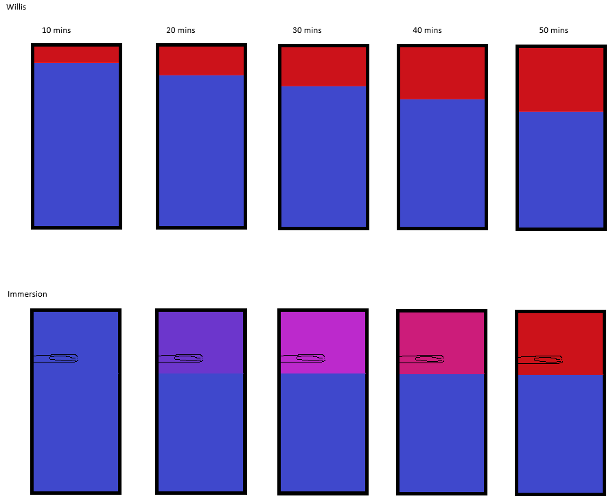 Now, you may insist on a 25 minute long shower, and you need the red water volume presented at the 50 minute mark to achieve this, so whether you have a Willis or an immersion, you wait the 50 minutes, to get the reddest volume, and that is the exact and perfect volume for your shower. It makes no odds to your whether you have a willis or an immersion