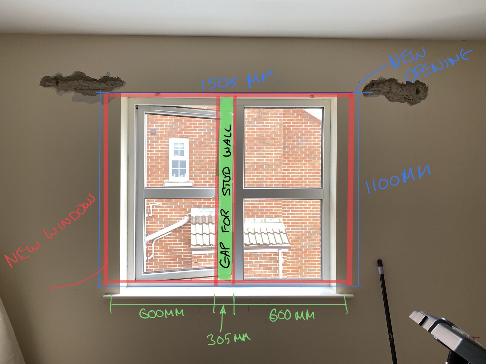 This image is showing the new opening size and the plan for the new windows. I want to move the windows out by 140mm on the right hand side and 185mm on the left. This leaves around 6 inchs of header on either side. Both of the new windows will be 600mm wide leaving a 300mm gap in the middle that will allow me to build a stud wall.