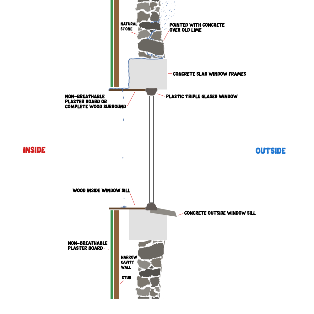 One of these is that previously they removed the traditional smaller windows and replaced with bigger plastic triple glazed ones. The issue is not the windows themselves, but the huge bulky concrete frames that surround the windows on the house. These frames hold up the original stone walls.