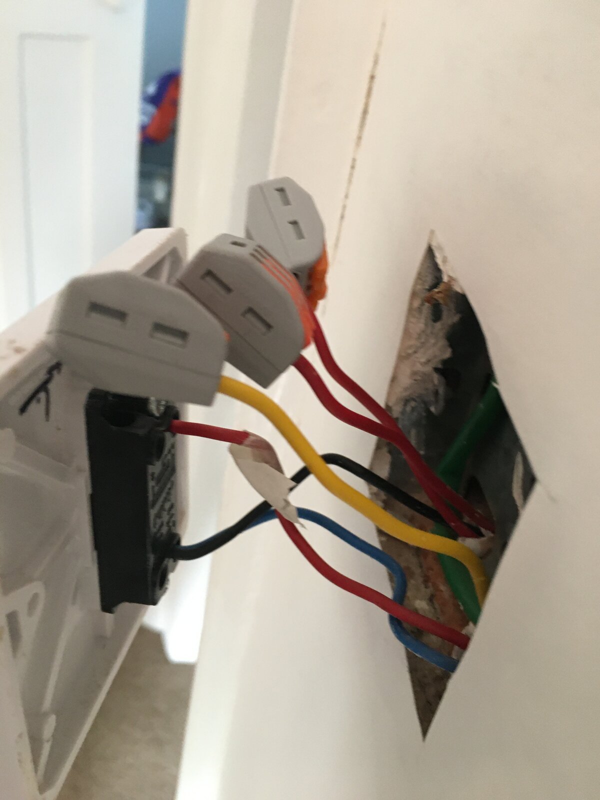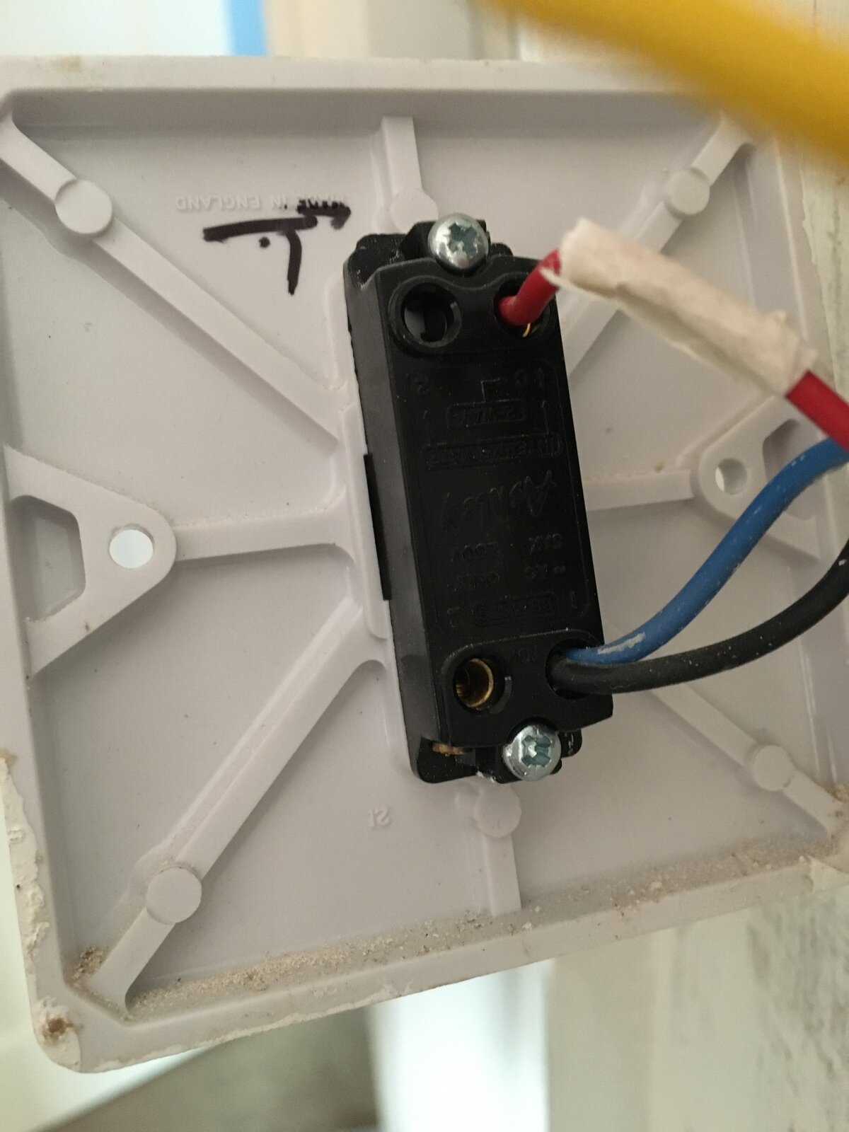 I undid the top floor light switch for papering yesterday to find 3 wires not attached at the switch when I removed it, the picture with the wagos are the wires that were lose (2reds and a yellow). The first picture shows red with masking tape in common and black and blue together, please note maskin tape on all wires was put on by me for ease of refitting. Now the picture with the yellow ring on is the wiring to the downstairs corresponding switch. Now on these wires coming out also my bedroom light next door is not working so I believe one of the reds is linked to that switch. I believe the yellow copied the downstairs switch next to the blue and black but unsure about the reds at the moment, when I get chance to take the light fitting off I may learn more as I’m wondering which one the switch live will be. I think one of the reds was a live and the other not but need to check all this out now the papering is done, just looking for info for when I get chance