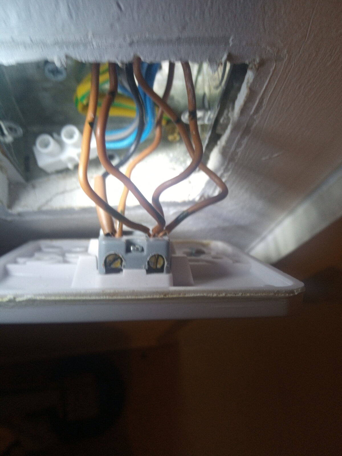 One of The 4 brown wires is likely the permanent line to the fan and its copper conductor may not be fully inserted and in contact with the terminal screw ,possibly clamping it's brown insulation. The copper May even be snapped .