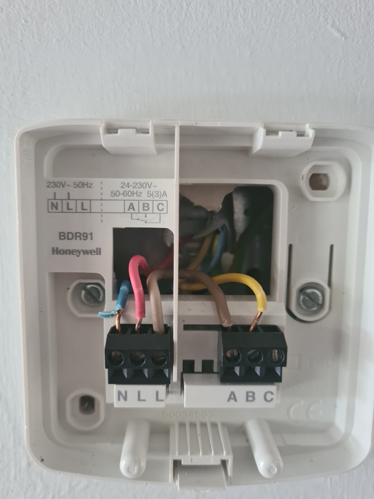 I am installing my Honeywell EvoHome in our new house and it should be easy. All I need to do is replace the Hallway Thermostat (Honeywell T6360B) with the Wireless Relay box (BDR91). However, I am not sure which wires from the old thermostat go into which places in the BDR91. As shown in the photo the hallway thermostat has four wires (inc the earth) and these go into locations 1, 2 and 4. I can work out which ones go to N and L in the BDR91, but do I need a 'switching live' (i.e. a separate wire from L to A), or where does the third wire from the hallway thermostat go into?