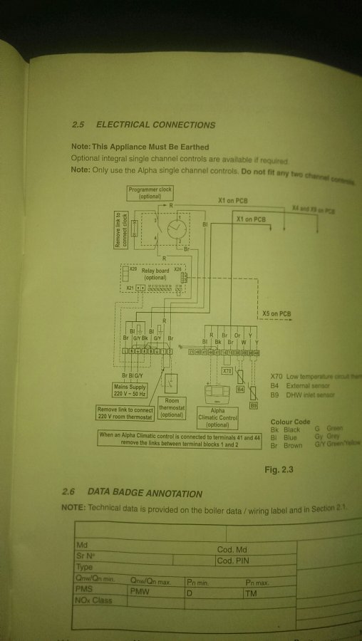I have a alpha boiler my room thermostat has broken so I bought a new one. It's a home easy he105 it has 4 position for wires llive negative sloff slon but when I looked at the one that's on the boiler it only got 2 wires going to it have included photo