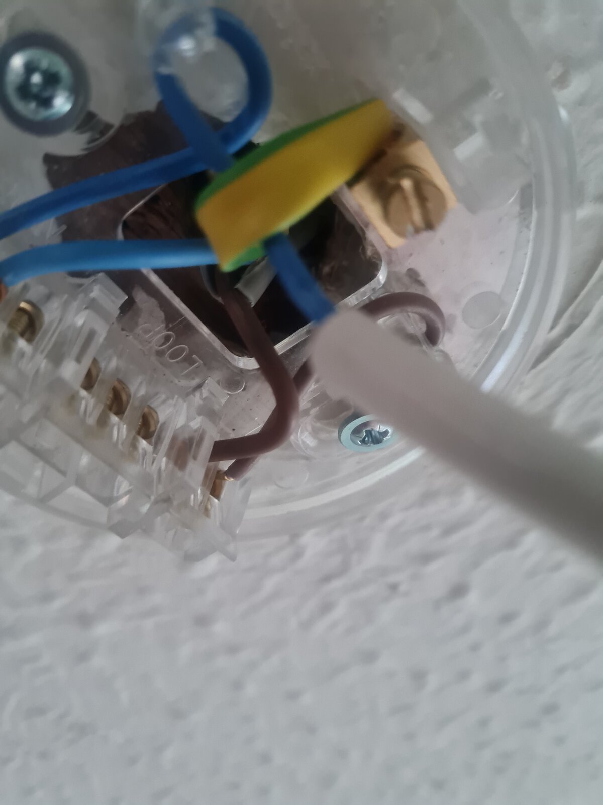 My new fitting has a three point terminal with the earth inserted with a metal tab. Therefore I presume the earth from existing would attach to this? However it also has two brown wires encased together in a white sheath ( so imagine these attach to live in the terminal) but then it has a blue and a brown wire also together encased in a sheath, which I am unsure about. Do these connect to neutral with them being both brown and blue. Any help appreciated.