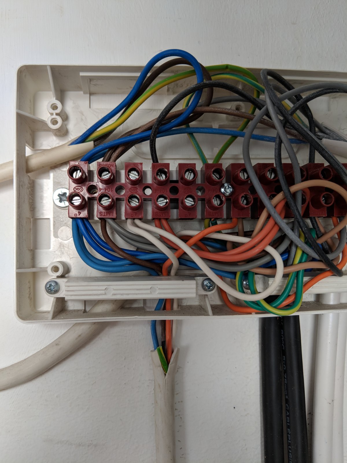 This is the junction box. RT500 coming from below. Wired controller off picture left. The cable exiting the box top right is going to the boiler. The two black ones going down are to the valves and the 2 white going down are to the hot water cylinder.