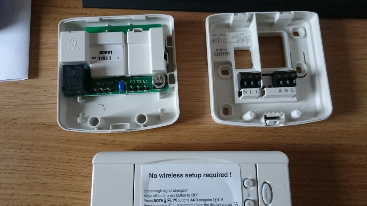 I can't get my head around this and I'm wondering if any of you can help me out. I currently have a Worcester Heatslave 15/19 Oil Boiler, it is controlled with a Programmer in the Kitchen, where I can tell both the Hot Water and Heating to come on, and set times for weekdays and weekends. Strangely, there's also a ETS 1 Lifestyle Thermostat in the Boiler room. (not the best location) I have bought a Center Wireless thermostat in order to better manage my heating and to hopefully save some Oil. I want to keep the programmer in the Kitchen as it also controls the water.The RF unit (BDR91) needs to be installed near to the boiler. I Imagined the Wiring would simply replace the current thermostat but it doesn't look so easy. Will upload several pictures to illustrate. Can anyone help with my wiring? Is it possible?