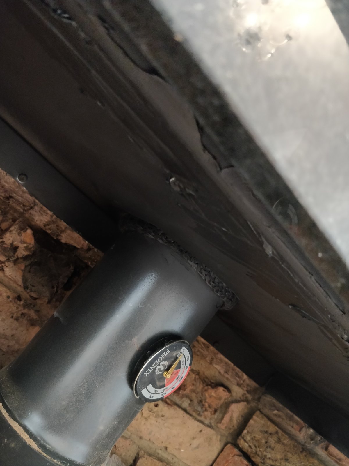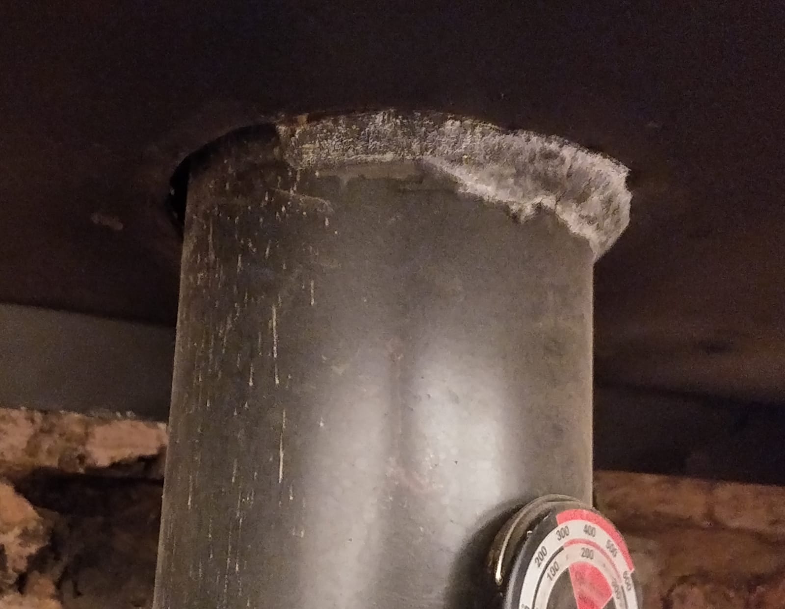 Looking at where the stove pipe goes through the register plate, I think he's stuffed some stove rope in there, where a collar would be so much neater.