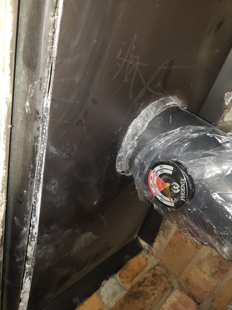 I managed to get B. back. He has removed the old fire cement around the pipe and he has fixed the register plate.