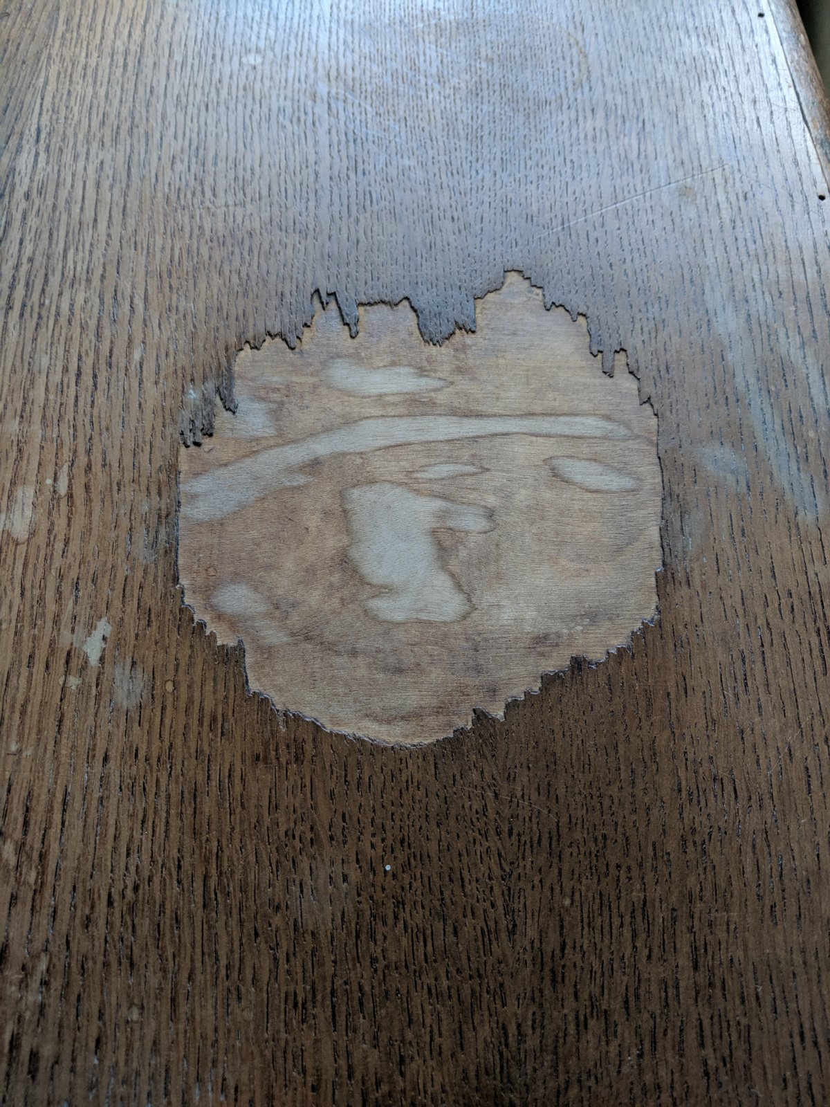 Hi, I recently bought a small second hand wooden table and the top is missing a part of the veneer right in the middle. I'm not sure what to do about it. Should I sand the whole top down to remove all the veneer? If so, what do I then replace it with? It isn't great wood underneath the veneer so can't leave it. Or is there another option? Thanks.