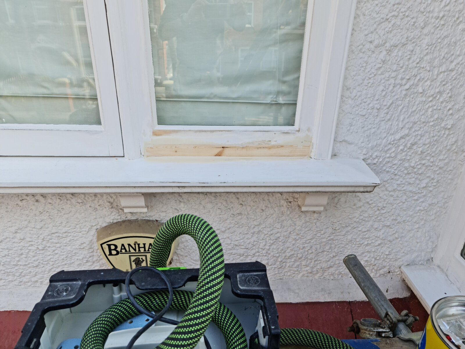 In the next image, I had to dig out most of the lower part of the window and splice in a section of 40mm tall by about 12mm deep timber using epoxy resin