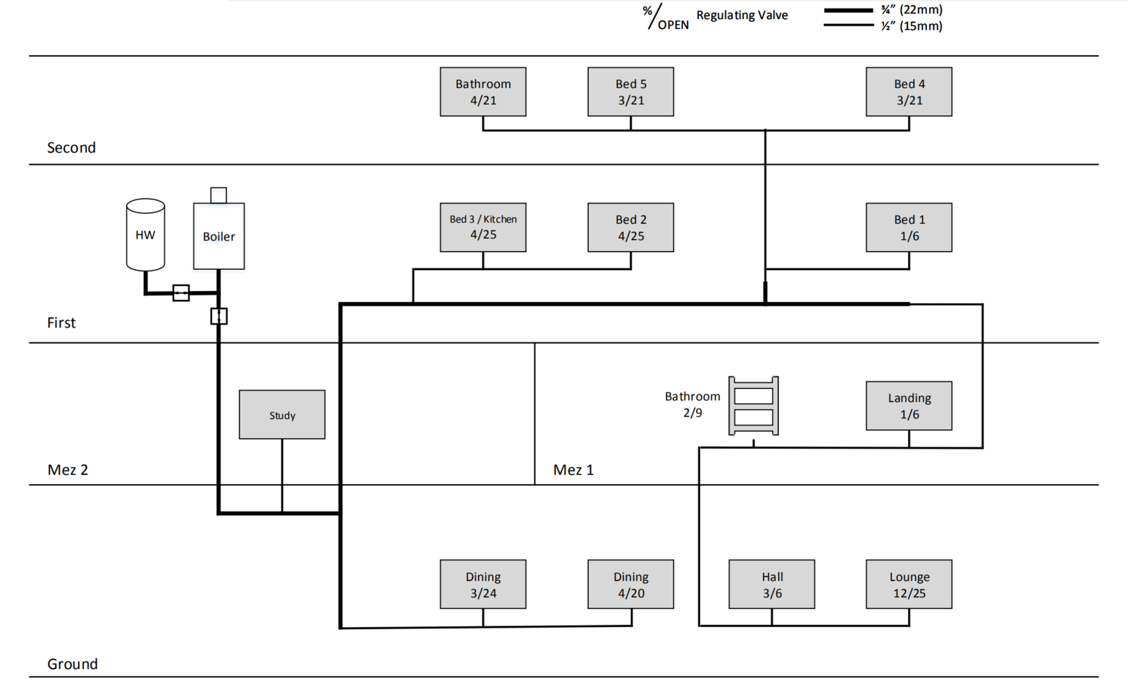 Actually - my description above isn't quite right. Here's a plan of the system. There are 2 additional ground floor radiators added since I drew this. The pipework from the boiler to ground is 3 years old, from first to second is probably 2.5 years old. The rest is very old, but only the bed2 and bed3 radiators are 'original' (~20 years)