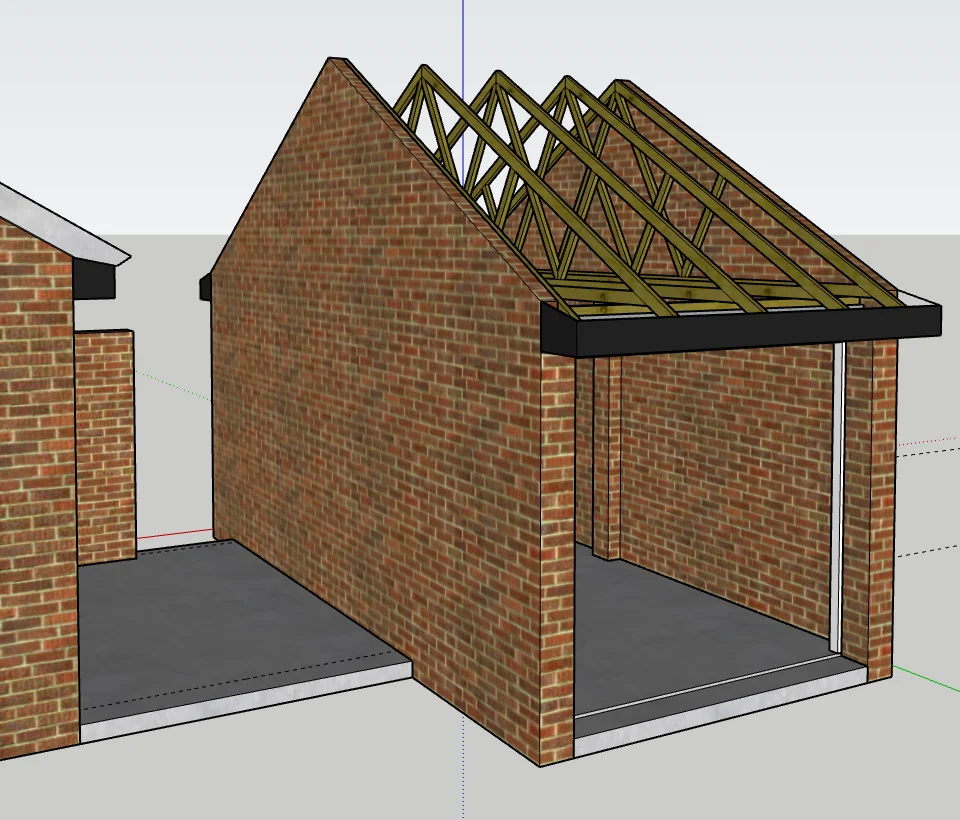 It's a detached garage with "side gables" and doors at each end. I'm thinking about extending it out to the side, and wondering if I can create an opening like pictured. The roof structure is supported by a lintel at each end above the doors, and those lintels rest on the corner pillars.