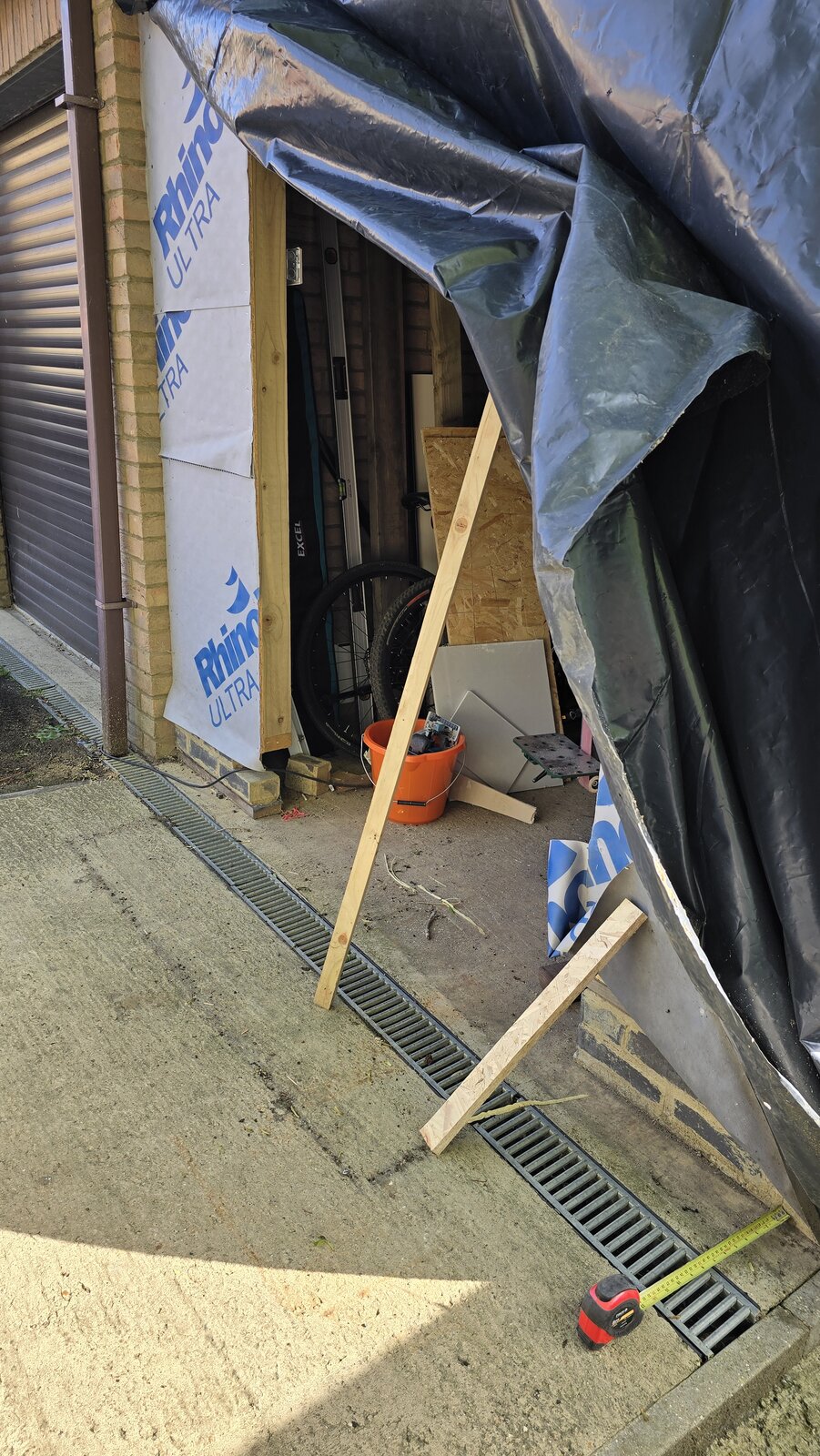 DIYer in need of some help. One wall of a new large lean-to shed / workshop will not overhang an existing concrete base (other 2 sides do overhang). I had a 2 course engineering brick base laid around the perimeter. The wall face in question will have a roller shutter door but the problem is the brick base around the opening is small and is easily knocked and detached - and rebuilt twice now.