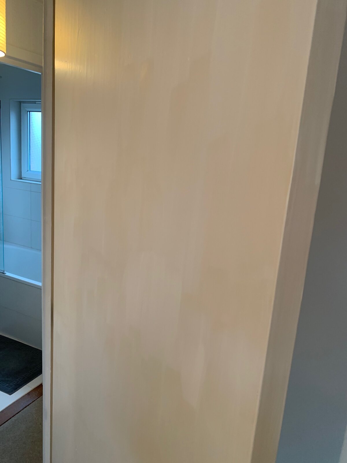 I have some internal doors with a super glossy paint on that I'm trying to paint a matt white. I've just put a light coat of Zinnser 123 on them (photo of current state).
